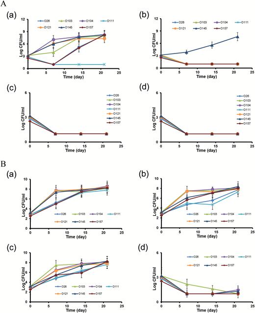 ![Non-O157 Shiga toxin-producing Escherichia coli (STEC) show similar survival patterns to E. coli O157 under osmotic and acidic stresses. Survival curves of STEC (O26:H11, O103:H1, O104:H4, O111:NM, O121:NM, O145:NM, and O157:H7) under various (A) osmotic pressure [aw 0.98 (a), 0.97 (b), 0.96 (c), and 0.95 (d)] and (B) acidic stress [pH 7 (a), 6 (b), 5 (c), and 4 (d)] are plotted. Cells were inoculated at 3 log CFU/ml and incubated at 22°C for 3 weeks. Survived cells were enumerated on tryptic soy agar (TSA) plates at 37°C. Data from three independent experiments are presented as means.](/uploads/img-37.jpeg)