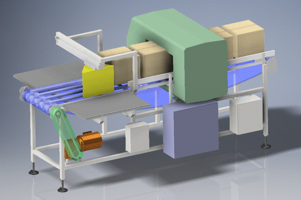 This Conveyor inspects sealed boxes with product before shipping. The Detector utilizes an automatic reject system, which signals a pusher to remove the package from the conveyor then onto a side table. Contamination of food by metal shards from broken processing machinery during manufacture is a major safety issue in the food industry. The Detector can pick up fine particles of ferrous, non-ferrous and stainless steels.